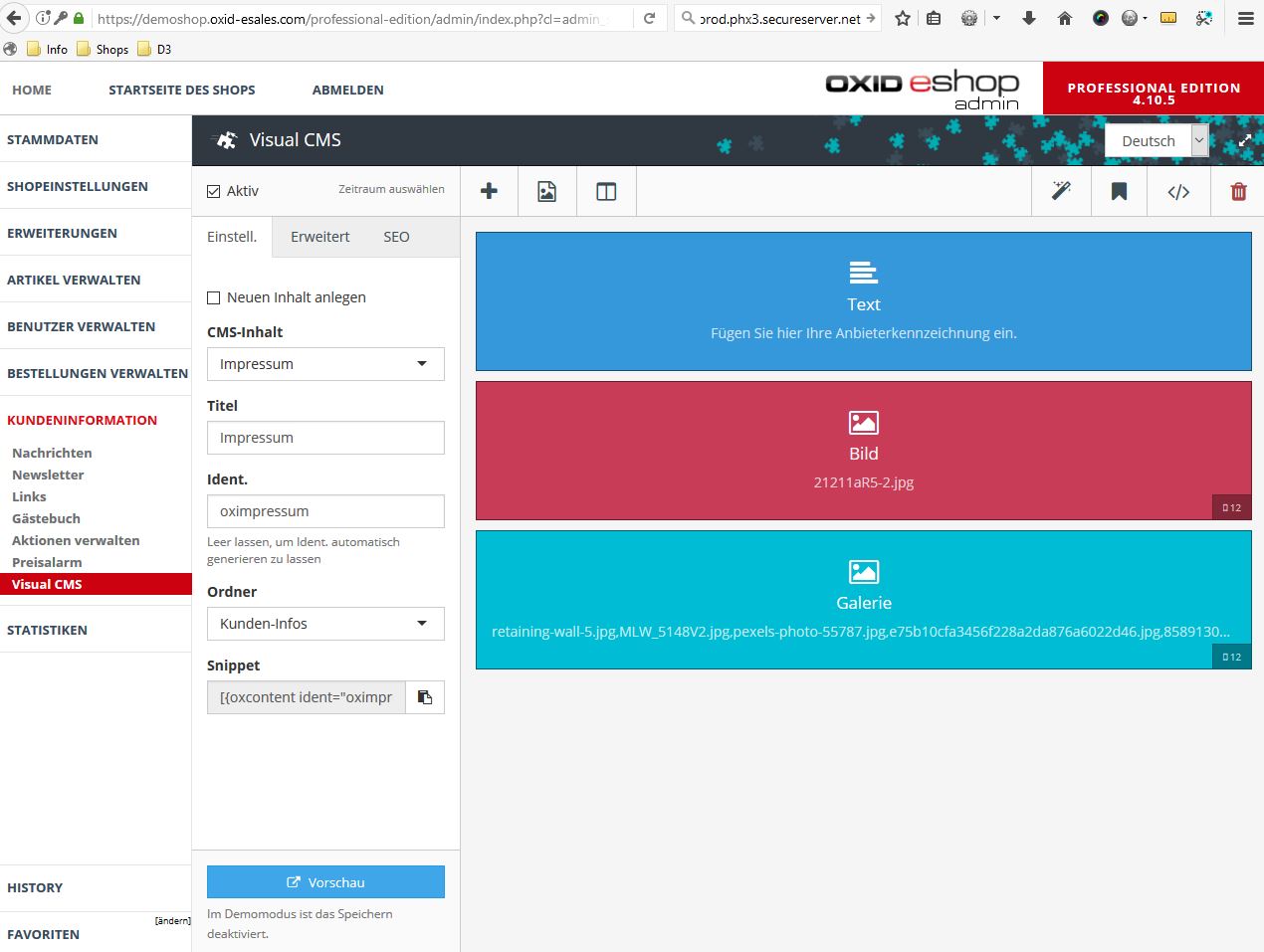 | Steps To Reproduce | https://demoshop.oxid-esales.com/professional-edition/admin/ > login > Kundeninformationen > Visual CMS > open "Impressum" > + (Widget hinzufügen) > "Bild" >> "Bild hinzufügen" >> select new oder existing PictureX >> "übernehmen" >> "Speichern" > Widget "Bild" over the entire width (see attached file) > + (Widget hinzufügen) > Galerie >> "Bild hinzufügen" >> select new oder existing Picture1 >> "übernehmen" >> "Bild hinzufügen" >> select new oder existing Picture2 >> "übernehmen" >> "Bild hinzufügen" >> select new oder existing Picture3 >> "übernehmen" >> "Bild hinzufügen" >> select new oder existing Picture4 >> "übernehmen" >> "Speichern" > Widget "Galerie" over the entire width (see attached file) > (Impressum) "Speichern" > open Fronend > open Impressum: http://demoshop.oxid-esales.com/professional-edition/Impressum/ > click at the first Picture in the "Galerie" > Zoom-Picture is the this from the second Galerie-Picture > if you click at the second Picture, the Zoom-Picture is this from the third Picture > and so on... (works also with "Vorschau") | ||||