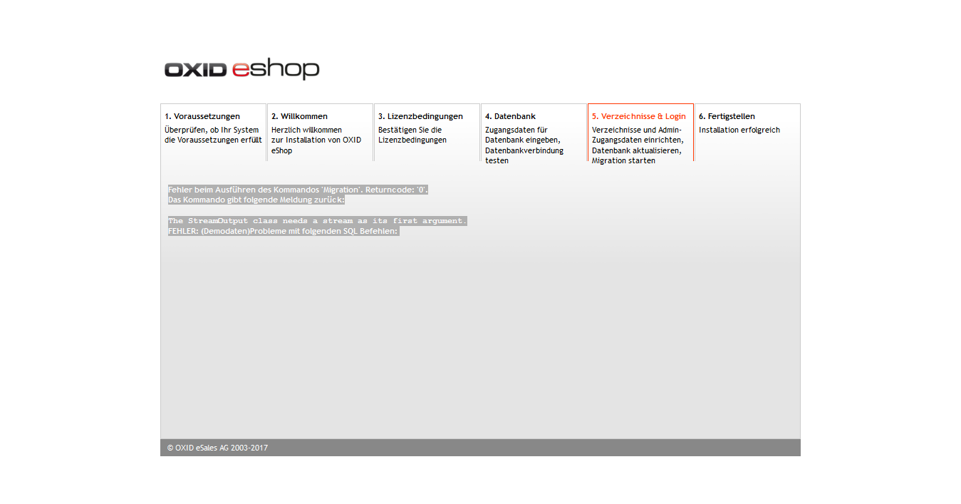 | Description | During Install OXID6 CE i´ve got this error: Fehler beim Ausführen des Kommandos 'Migration'. Returncode: '0'. Das Kommando gibt folgende Meldung zurück: The StreamOutput class needs a stream as its first argument. FEHLER: (Demodaten)Probleme mit folgenden SQL Befehlen: The installation stops. | ||||