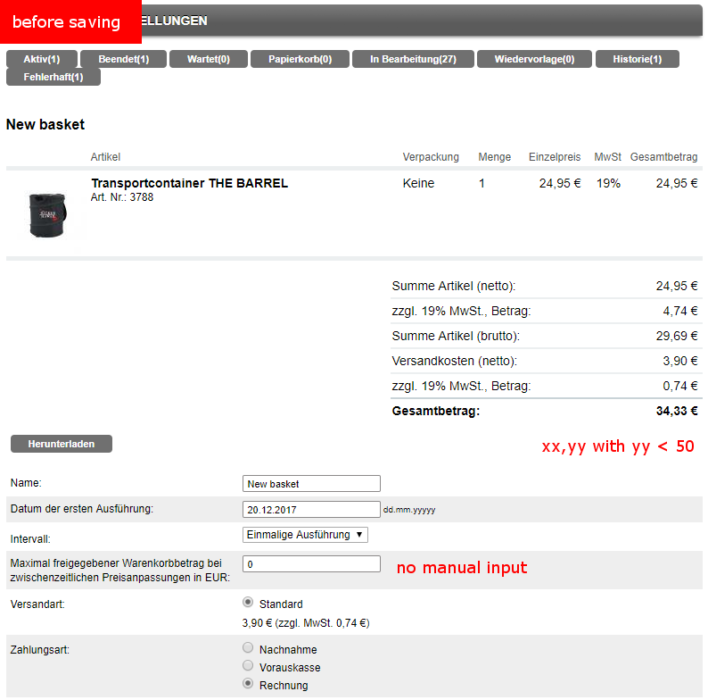 | Description | While creating a scheduled order, values with commas can be written to the shopping basket limit inputfield. Consequence: Values are rounded. Background: Database field (b2bscheduledorders__B2BBUDGETMAX) is type integer Problem: If basket amount is xx,yy with yy < 50 the limit is set to xx and the order won't be executed. | ||||
