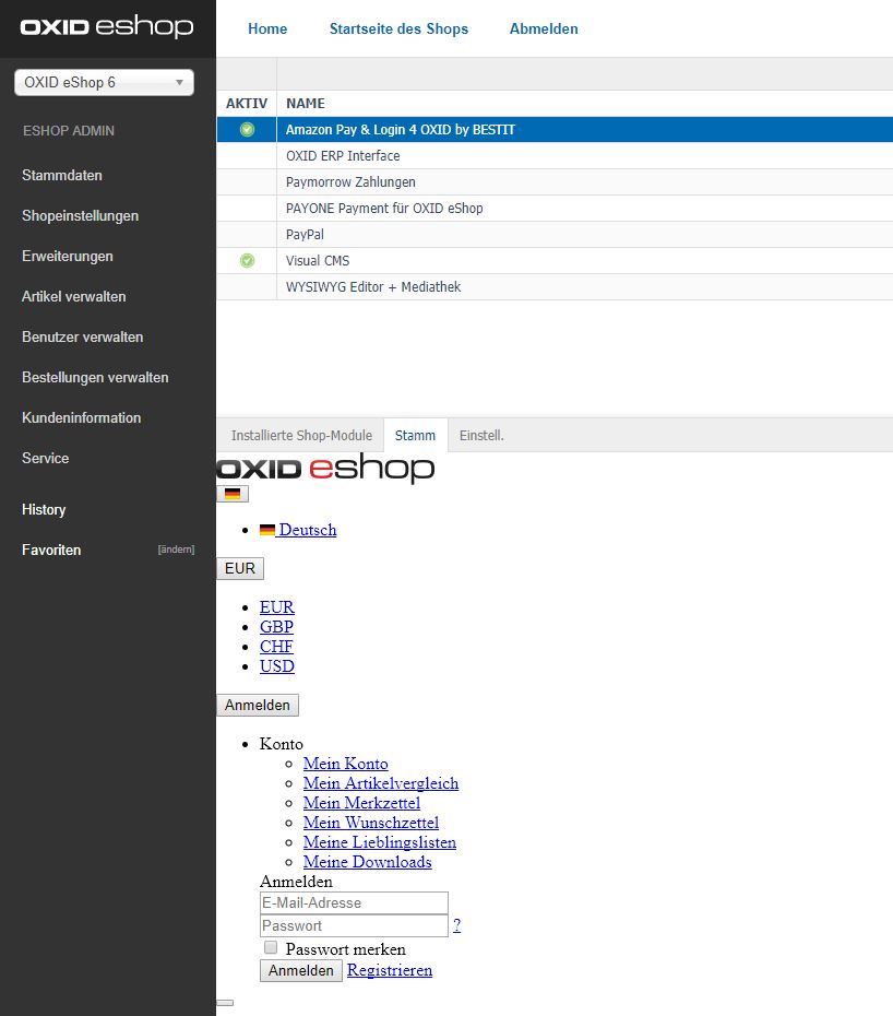 | Description | If you deactivate the Amazon Pay & Login 4 OXID by BESTIT module, the (incorrect) frontend will be shown in backend (Fig. 1) and the frontend doesn't work correctly anymore (Fig. 2). Problems also appearing in shop's EXCEPTION_LOG (see attached files). | ||||