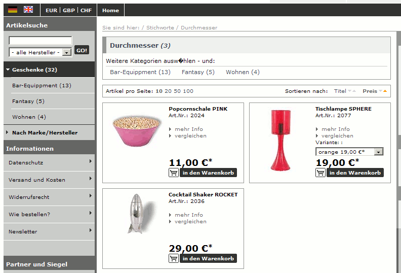 | Description | 1) Select a Product with tags which is in a category which has subcategories. 2) In detail view of product, click on a tag 3) all products with this tag are shown. As the active category is kept, the subcategory locator is shown, too. (See attached screenshot) IMHO this is a bug as in this case the products are browsed by tag, not by category any more. In the attached screenshot, I selected "Popcornschale Pink" which is in "Geschenke". In the detail view, i clicked on "Durchmesser" tag. Do not display category as active, when product list is displayed by tag. | ||||
