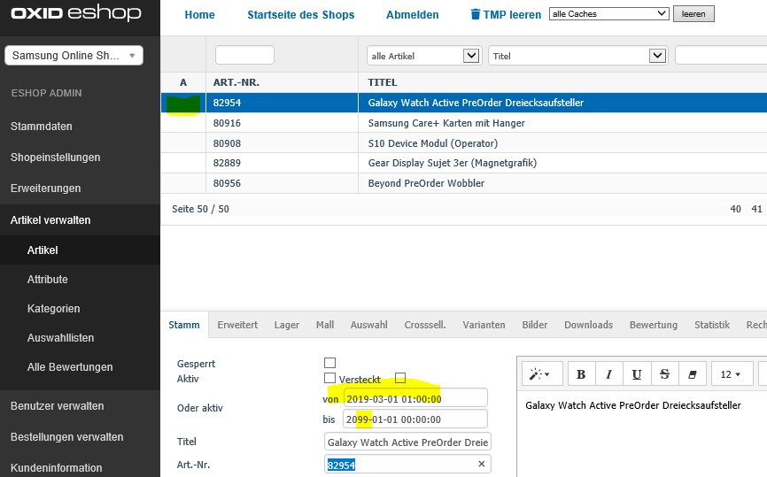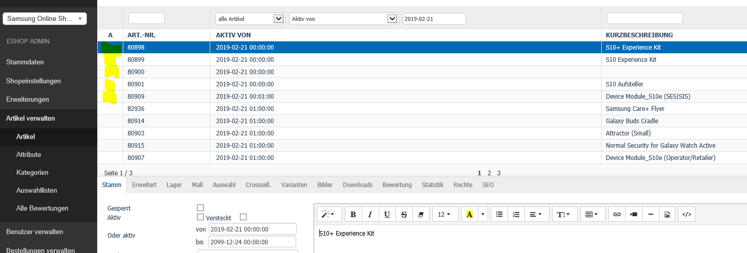 | Description | We have uploaded some articles with a certain activation date. Result: The articles were displayed at the time in the shop, but in the backend not marked as "active" with a green symbol. These articles are also not displayed on the start page “Just arrived” | ||||