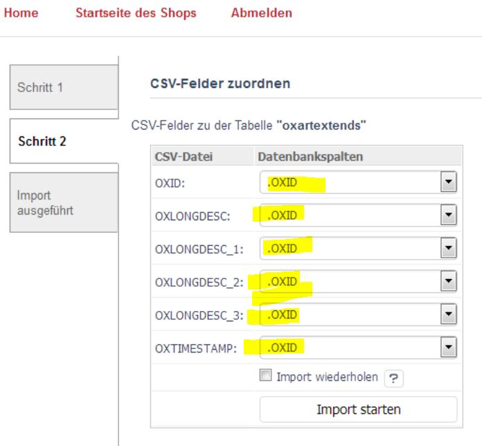 | Steps To Reproduce | 1. Admin -> Service -> gener. Import 2. Select table oxartextends 3. Select CSV File and seperator 4. In step 2 you can not select the corresponding database columns (only .oxid). See screenshot attached. | ||||