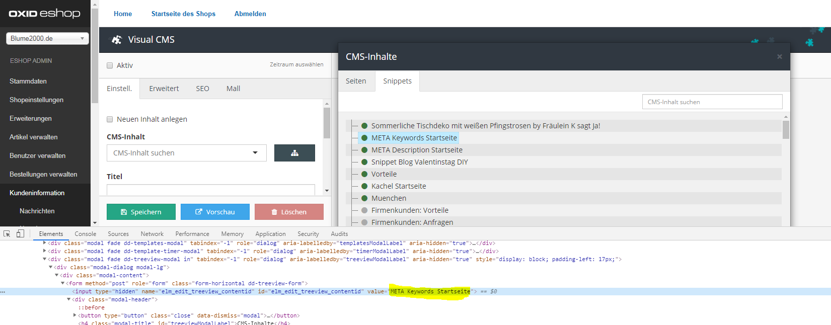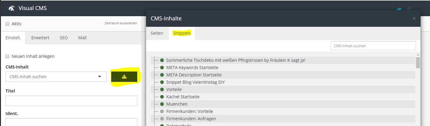 | Description | Its not possible to select an snippet element in the tree view cms content. The input field "#elm_edit_treeview_contentid" will filled with the content-id while toggeling the page-item.If you select an snippet item the input field wont fill with the content-id German: Bei der Auswahl eines Snippets über die Suche nach CMS-Inhalt, kann der Inhalt - die Widgets (oxcontent.oxcontents) nicht geladen werden. Das Feld "#elm_edit_treeview_contentid" wird befüllt, wenn ein Element (Seite oder Snippet) ausgewählt wird. Bei der Auswahl einer Seite wird die jew. content-id ins Feld geschrieben. Dies ist bei der Auswahl eines Snippets nicht der Fall - hier wird der Titel verwendet. Vielen Dank schon mal vorab fürs prüfen! | ||||