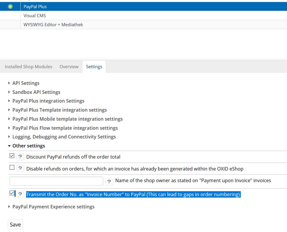 | Description | When an order is placed in OXID eShop Enterprise Edition 6.1.5 with PayPal Plus Extension 3.0.3, the payment goes through, but the order number is not transmitted, although "Transmit the Order No. as "Invoice Number" to PayPal (This can lead to gaps in order numbering)" is enabled in the PayPal Plus settings. | ||||