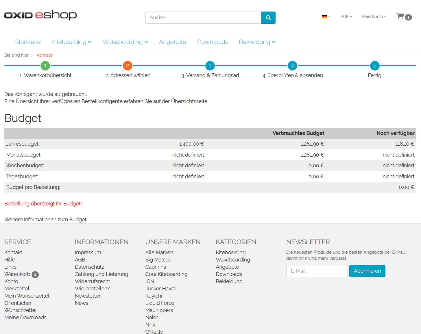| Description | In the OXID B2B Edition it is possible to order even if the budget is exceeded, if the approval procedure is deactivated and the budget is activated, by clicking manually on step 3 instead of the Next button . | ||||