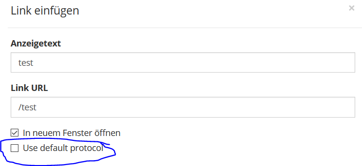 | Description | If you try to create a relative link, always a absolute link is saved. Example: Input: /kontakt (with/without / doeas not matter) Result:http:///kontakt | ||||