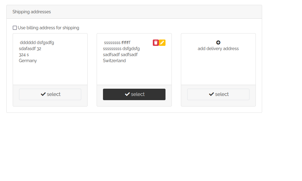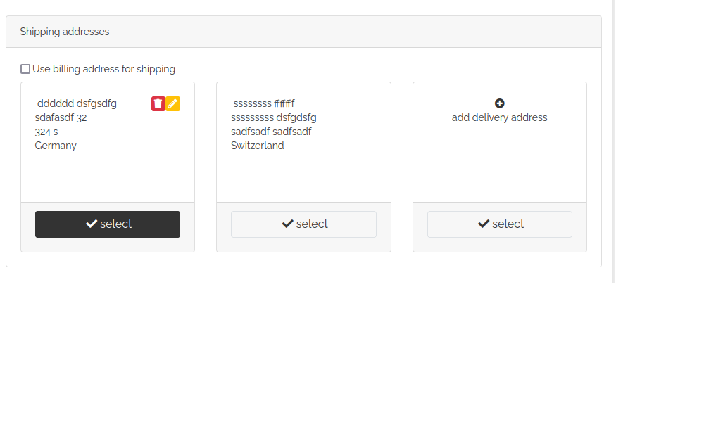 | Description | Delete and edit button in shipping address is showed only for selected address and its not possible to delete or edit address which is not selected |