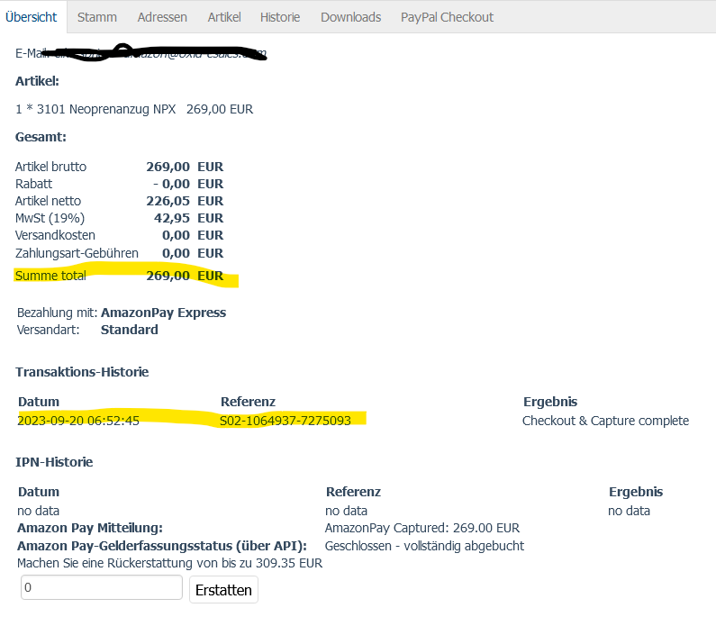 | Description | In a OXID eShop 6.1.6 with Amazon Pay 2.1.13, the transaction history under "Administer Orders" -> Orders -> a Amazon Pay Order -> Tab Overview -> Transaction-History won't be updated if you trigger a refund. | ||||