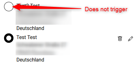 | Description | Switching between different delivery addresses in account and checkout is not possible. When clicking the the radio button of a second delivery address nothing happens. Clicking on "add new address" does work. | ||||
