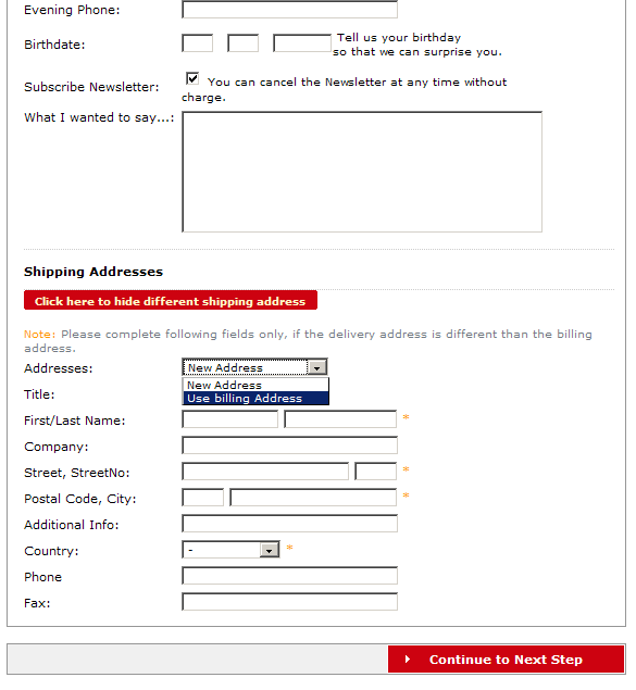 | Description | In step 2 of checkout, a different shipping address can be selected. Now, there is a selectbox "Addresses". In this selectbox, "Use billing address" can be selected. This does not work: The page reloads, the input fields for different shipping address are shown, but its values remain the same as before. IMHO 3 solutions (correct behaviour) are possible: 1) When selecting "Use billing address", hide the input fields for different shipping address. (Same functionality as "Click here to hide different shipping address") 2) Fill fields for different shipping address with values from billing address 3) Remove option "Use billing address" as billing address can be used by klicking on "Click here to hide different shipping address" Tested this in demoshop http://demoshop.oxid-esales.com/professional-edition | ||||