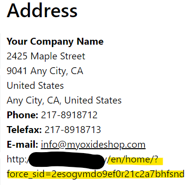 | Description | The OxidEsales\EshopCommunity\Core\ViewConfig::getHomeLink is incorrect if the URL contains force_sid. This is visible on the contact page in the address information. | ||||