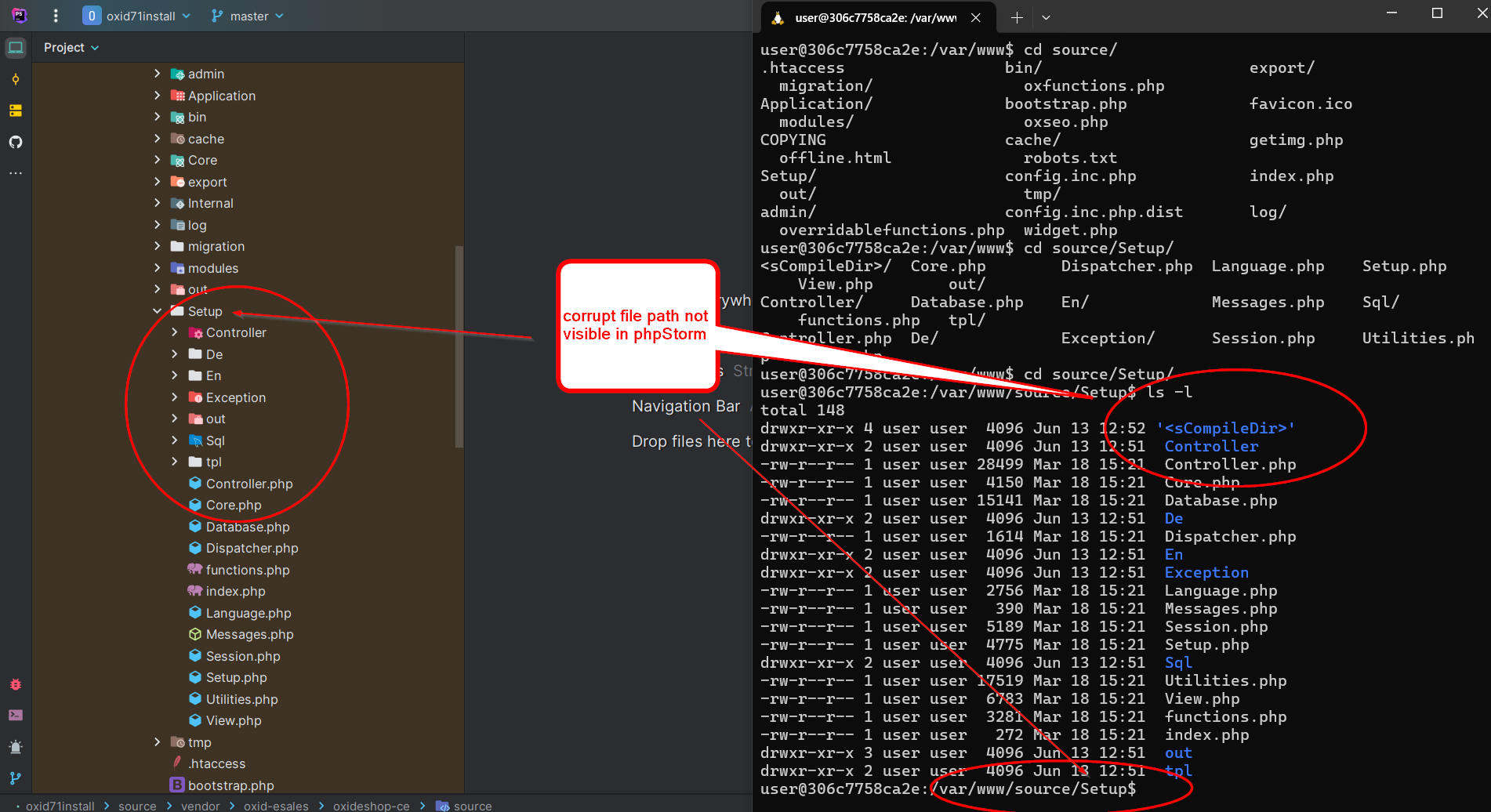| Description | When the OXID setup is started in the browser, the cache is already required and used, even though the cache directory does not yet exist. Since the variables <sCompileDir> and <sShopDir> are not yet set in the config.inc.php, a chain of errors may occur. OXID incorrectly tries to create the cache under /var/www/source/Setup/<sCompileDir>/. On some systems, this does not work and OXID then tries to write an error message to the log and also fails because the folder /var/www/source/Setup/<sShopDir>/log is also not writable. Many Linux systems can apparently handle corrupt paths. At the file level, this then looks like the screenshot. However, the path is invalid for phpStorm and phpStorm cannot display the path. | ||||