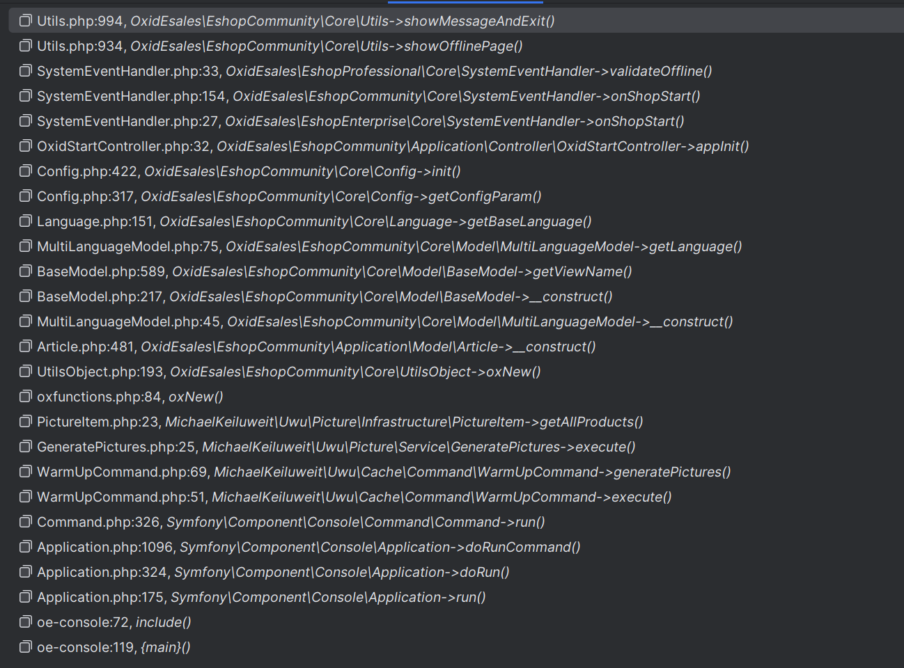 DescriptionIt can occur that the method \OxidEsales\EshopCommunity\Core\Utils::showOfflinePage is triggered in the context of the oe-console. That leads to an empty response and it seems like the executed command is finished immediately. There will be no error message in the console, nor will there be a entry in the log file oxideshop.log. So the person is left clueless.