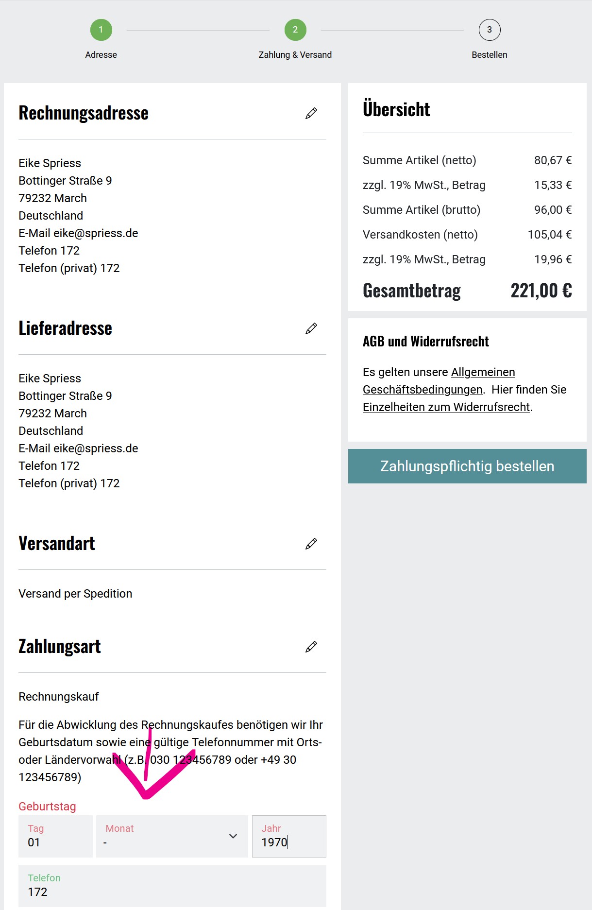 | Steps To Reproduce | - go through the checkout - select oscpaypal_pui as payment method - enter day, year and phone but not month - submit order - you should see the maintenance site and an order with oxfolder = error My test user didnt have birthdate set in oxuser, so nothing was pre filled. | ||||