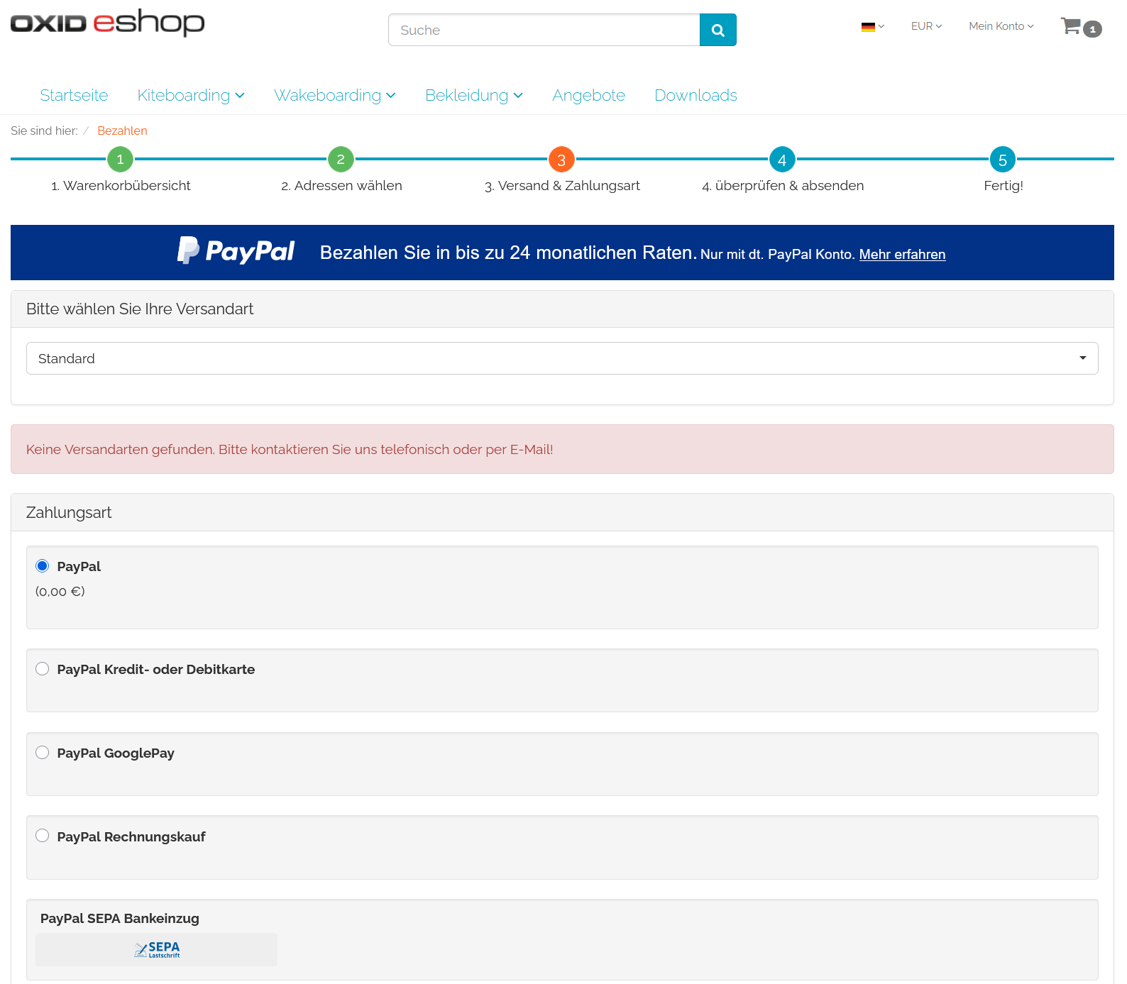 | Steps To Reproduce | Problem with SEPA direct debit. When you select SEPA direct debit as the payment method in step 3, the PayPal overlay opens. If you close it immediately (either by closing the overlay or clicking the cancel button) and select a different payment method and click the continue button, an error message appears stating that no suitable shipping method was found, even though this does not happen if SEPA direct debit is not selected first. | ||||