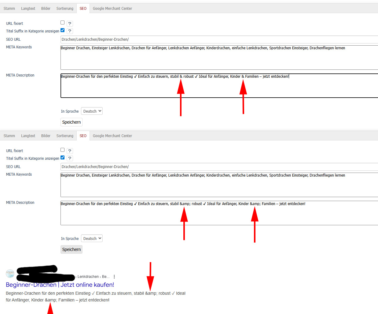 | Description | In the SEO Tab for products and categories saving Meta Keywords or Descritions an & will be replaced by & when pressing save. This is a new behavior in the Oxid 7 series, i have tried it also in Oxid 6.4.3 and there and & will be saved as it is without replacing it. This new bevhavior has a bad side effect, as the listing on Google / search engines are printing the Meta Descritions with the & instead of only & I have attached .jpg where you can see it | ||||