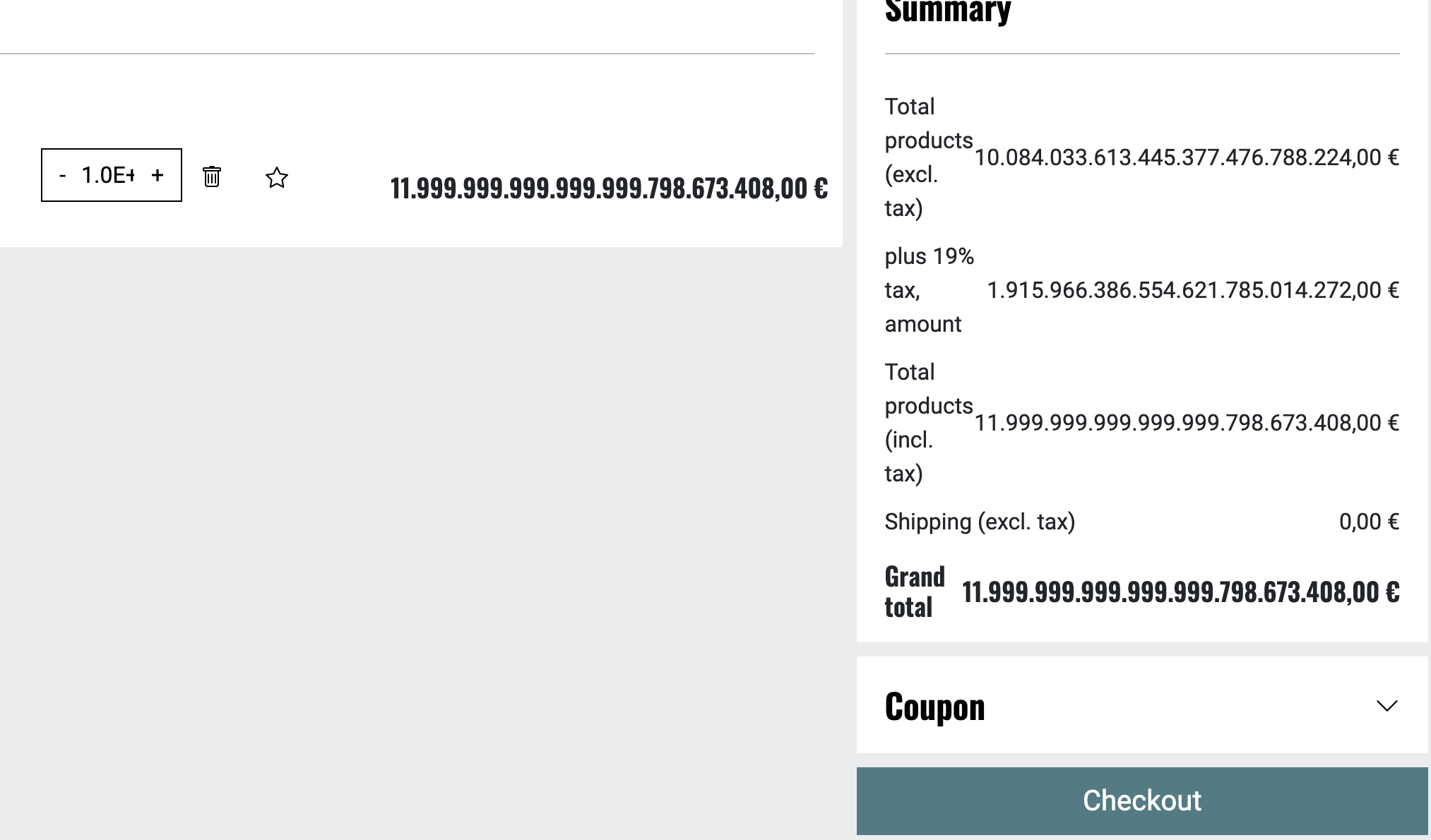 | Steps To Reproduce | * Add a product to the cart * Enter a very large quantity (e.g., multiple digits / extremely high number) * Observe the cart summary section | ||||