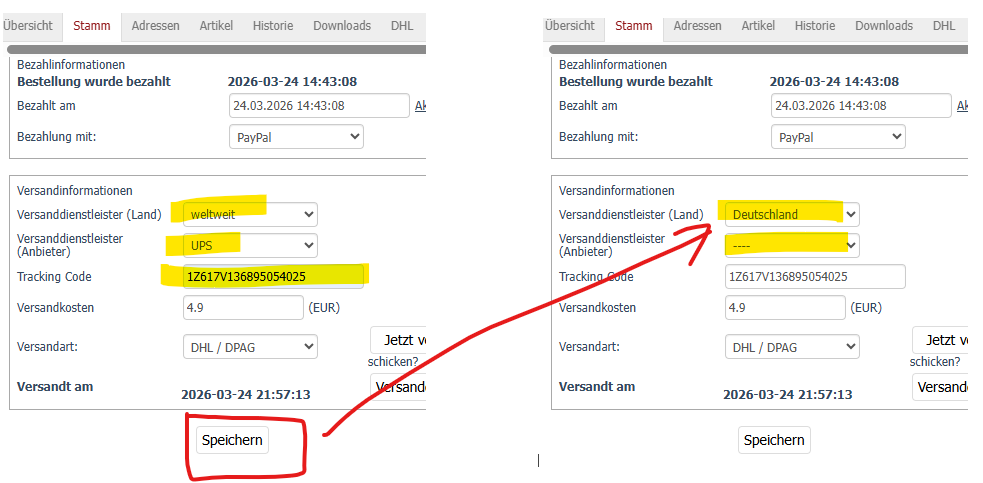 | Description | Current version of the PayPal module (2.8.1 and 3.7.1) The country selection / courier selection still does not work as intended. Background information from the customer: We, or one of our suppliers, ship within Germany using UPS. UPS is still not selectable from the list (when the country is set to Germany): If I select ‘Worldwide’ as the country, I can choose UPS, but when I save, the shop reverts to Germany and UPS disappears again. | ||||