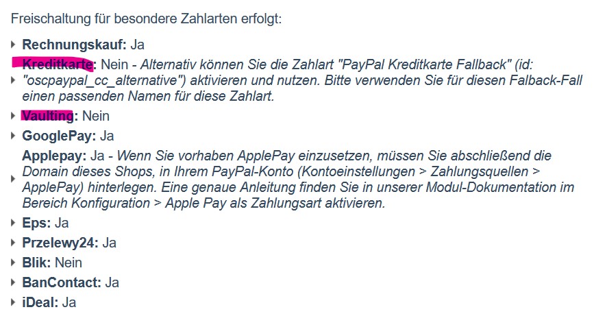 | Steps To Reproduce | 1. Do PayPal Onboarding 2. Deactivate Payment Methods - PayPal credit or debit card - PayPal credit or debit card fallback 2. Deactivate Acdc and Vaulting /var/configuration/shops/1/modules/osc_paypal.yaml oscPayPalSandboxAcdcEligibility: type: bool value: false oscPayPalSandboxVaultingEligibility: type: bool value: false | ||||