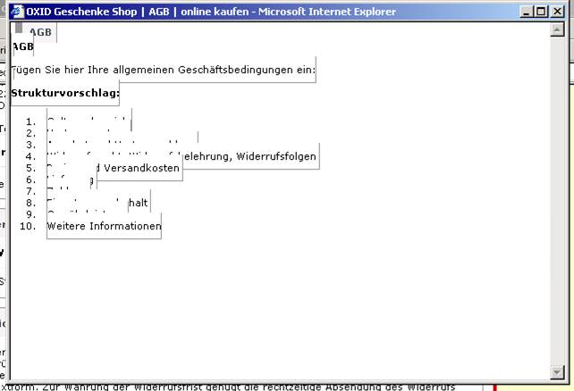 | Description | If you follow the "AGB" link in step 4 of the order process then popup shows an unreadable content - this is propably an CSS issue with IE6 (see uploaded picture). | ||||